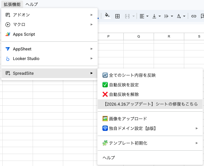- 上部メニュー「拡張機能」→「SpreadSite」→「【2026.4.26アップデート】シートの修復もこちら」をクリックしてアップデートします。