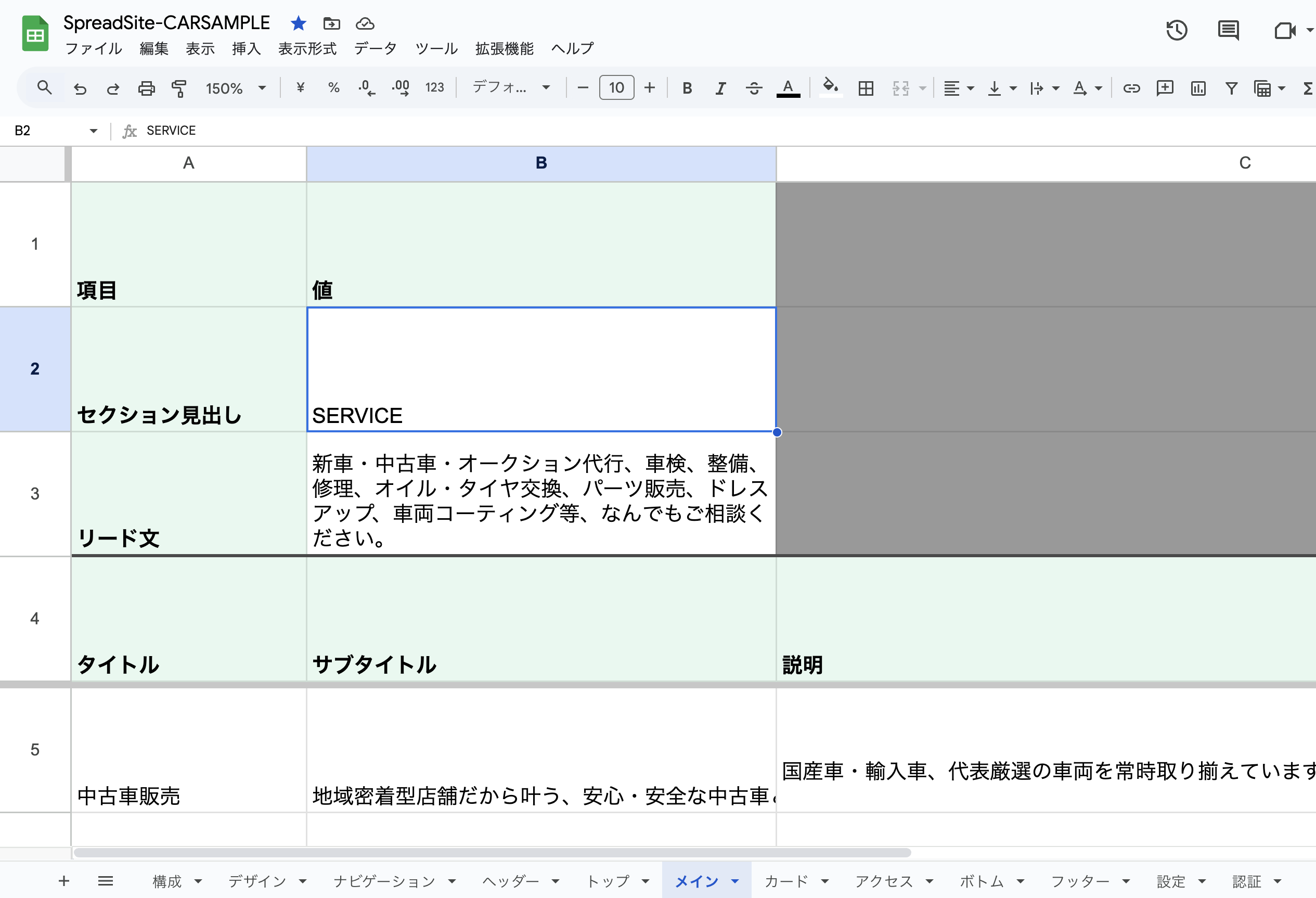 - 「セクション見出し」の行のB列に、セクション全体のタイトルを入力します。(例:Our Services, 料金プラン など)